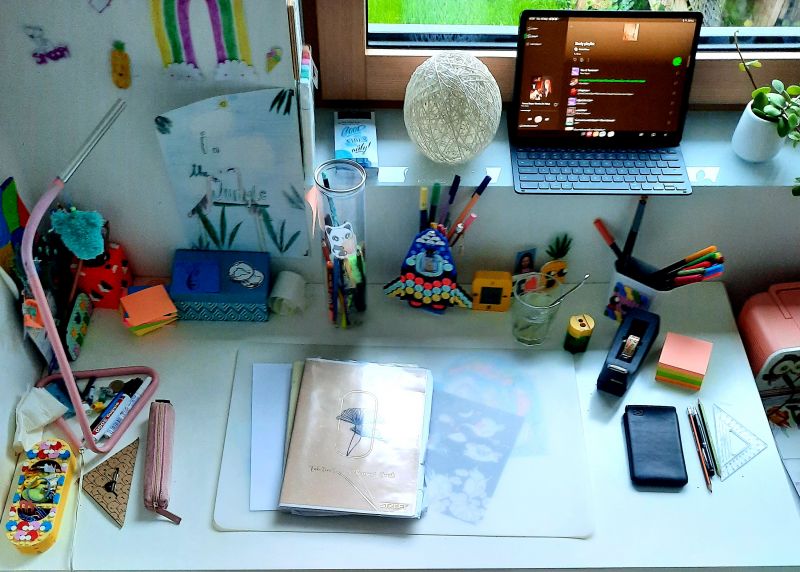 tko mam jaz ko se učim, mal glasbe, listi, zvezki, pisala (pa deževen dan).