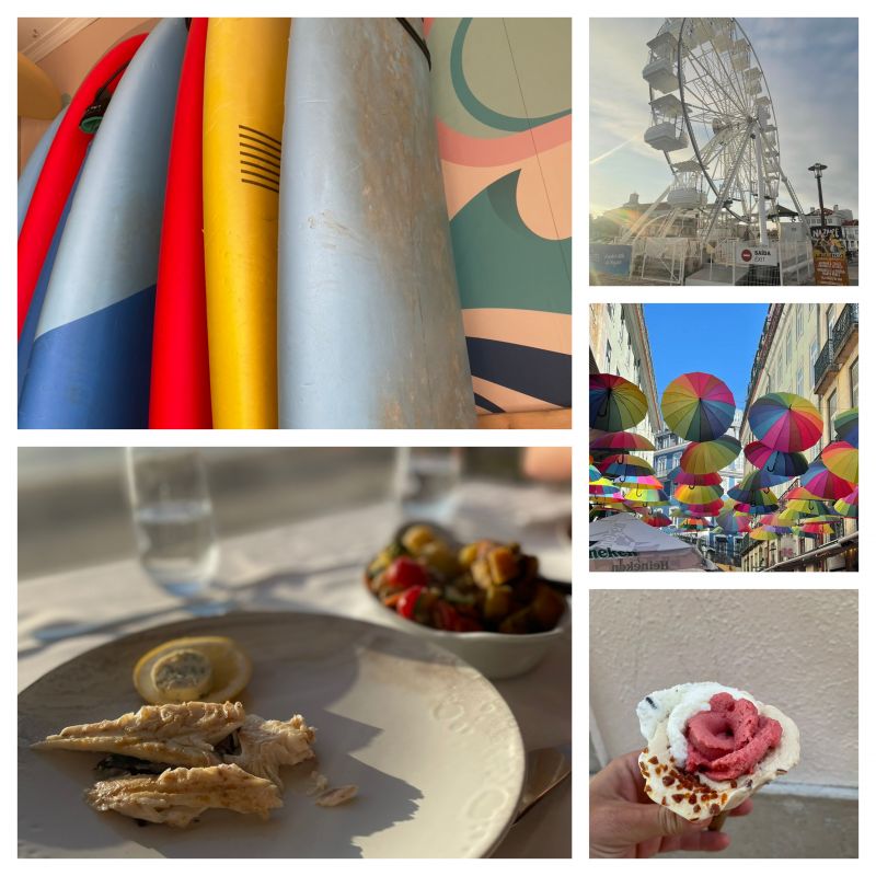 *modra*PONEDELJEK:*modra* Šli smo si ogledat še tri gradove v Sintro, pol smo pa šli v Lizbono ker smo mogl vrnt avto. Mal smo hodil po lizboni, po ulicah mi je ful cute k majo mavrične dežnike obešene:umbrella2: Šla sm še na en sladoled, k si zbereš al boš mel majhen, srednji al velik kornet, pa ti nardijo v obliki vrtnice, in to s kolkor okusi sam hočeš!