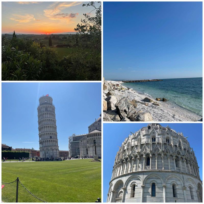 No včeraj smo že spali v Toscani. Šli smo v mesto Lucca, kjer smo ena taka cudna kolesa za vec oseb vozil. Pol smo šli še v Piso, pogledat stolp in katedralo, na koncu pa še do morja. Prilagam kolaž(stolp v Pisi in katedrala, plaža in razgled z našega Agro turizma)