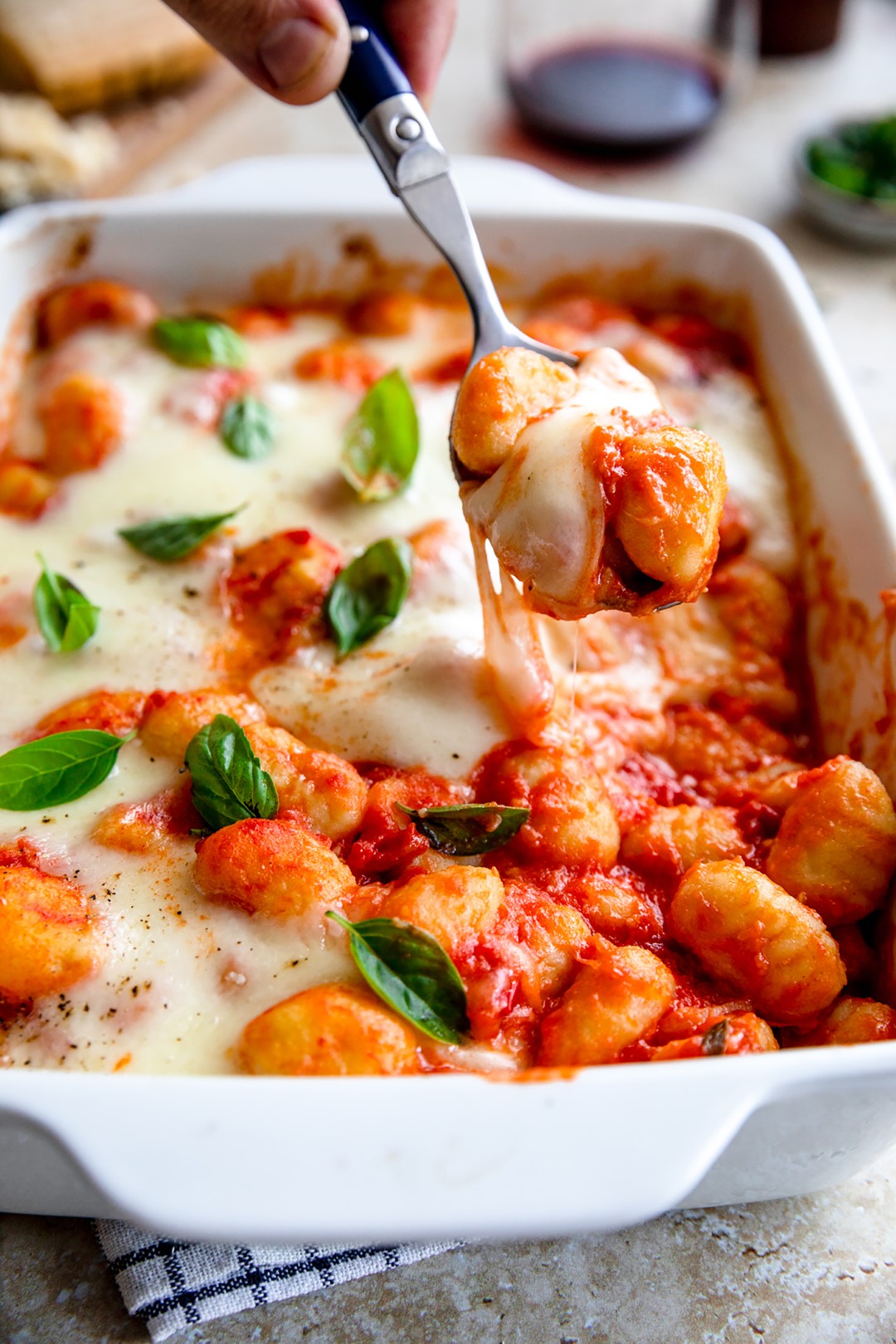 Njoke zmešaj z omako in dodaj polovico vode od kuhanja (po potrebi še preostanek). Vse skupaj prestavi v pekač, po vrhu razporedi narezano mocarelo in peci 10 – 12 minut pri 210 °C. Pred serviranjem potresi s svežo baziliko.