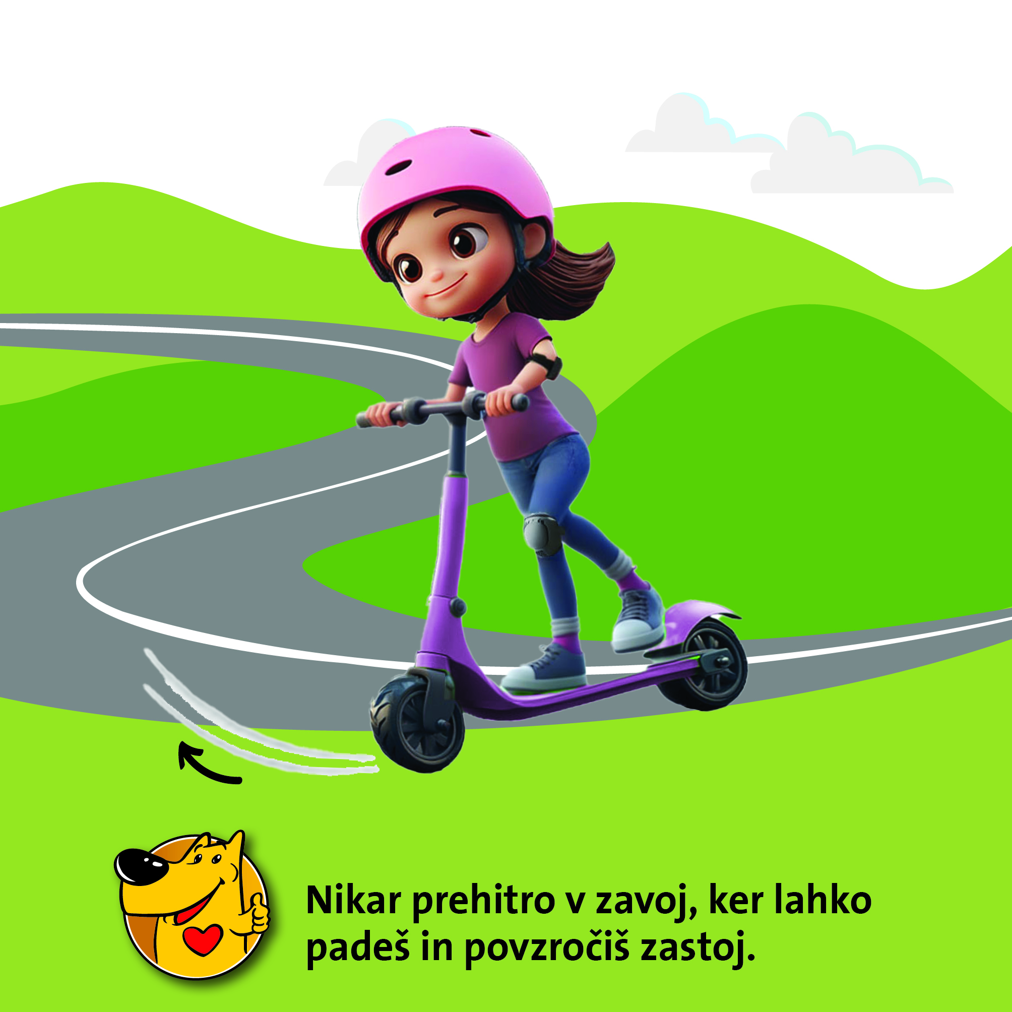 Ker ima skiro zelo majhna kolesa, se tudi asfalta dotika le z majhnimi ploskvami. Če krmilo obrneš prehitro in narediš oster zavoj, kolesa zdrsnejo hitreje kot pri vožnji s kolesom. Zdrs pa je še hitrejši na mokri podlagi. Zato si za zavoj vedno vzemi dovolj prostora in se izogibaj nenadnim spremembam smeri.