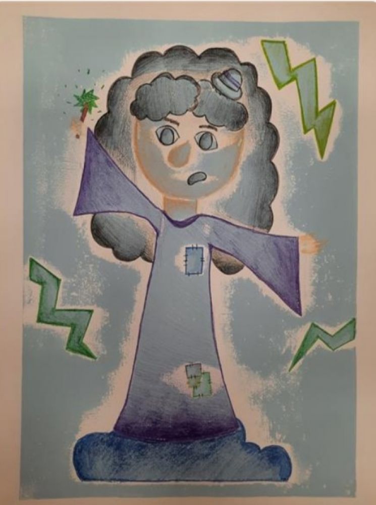To je čarovnica Strela, ki nadzoruje nevihte. :thunder_cloud_rain:Naredila sem matrico in jo nato še dodelala z barvicami.