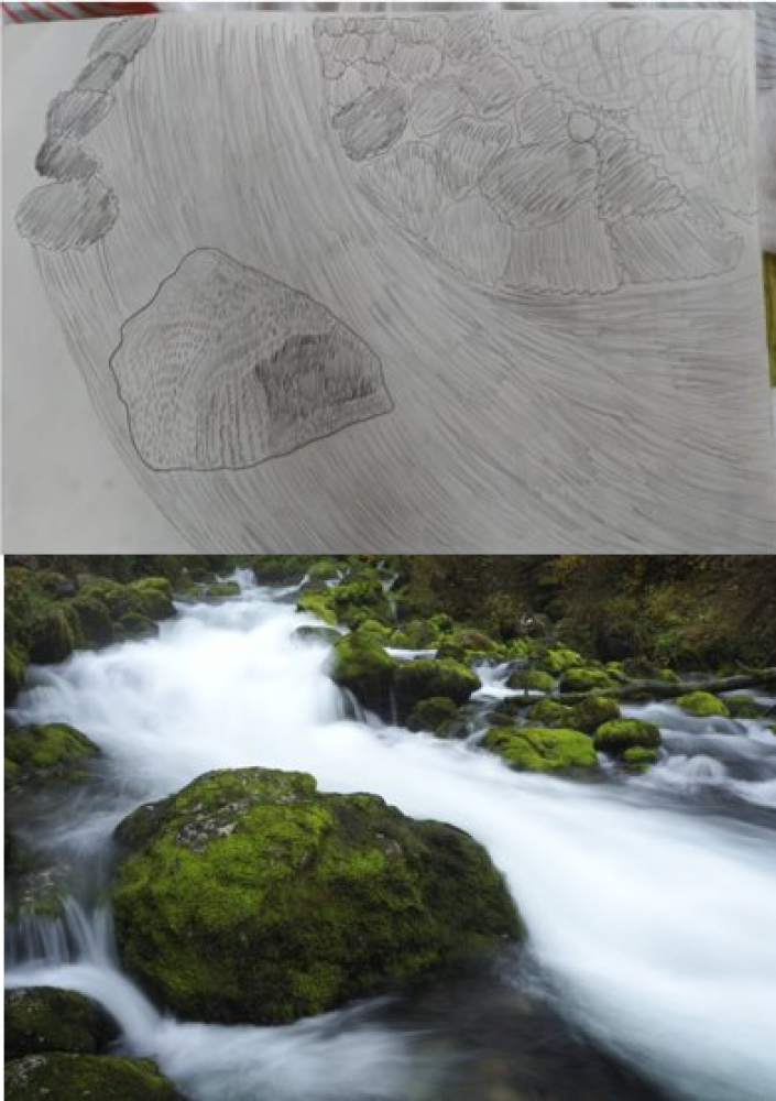 Ni toliko slabo, ampak bi bilo mogoče malo bolje, če bi zasenčila tisti del, kjer si z svinčnikom 'barvala', saj izgleda kot da imajo kamni nekakšne dlake. Ter tisti del zgoraj desno, bi lahko malo zasenčila, ali pa vsaj naredila obliko listov, ali nečesa. Pa spodaj levo, bi lahko dopolnila tisti del. Drugače pa ni slabo :ok_hand: