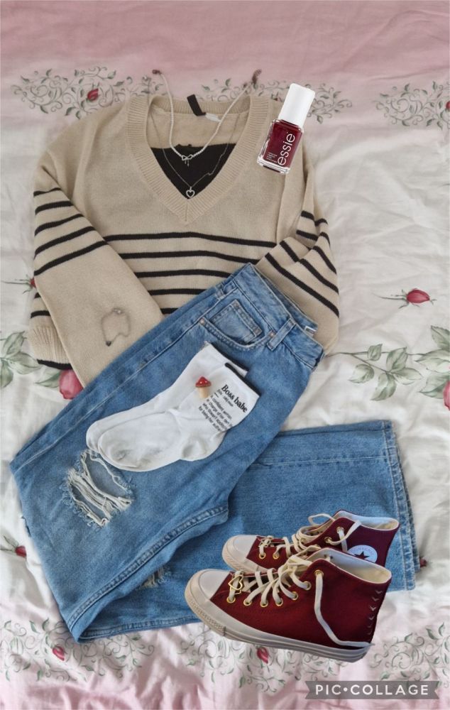 moj danasnji outfit je sestavljen iz sirokih strganih hlac, kjut crne majcke brez rokavov ki ma spredaj mini pentljo, in cez pulover. itak da sm rabla dodat nakit, cevlji pa so nove rdece all starke k so probably najlepsi cevli k sm jih kadarkol vidla in mela :)