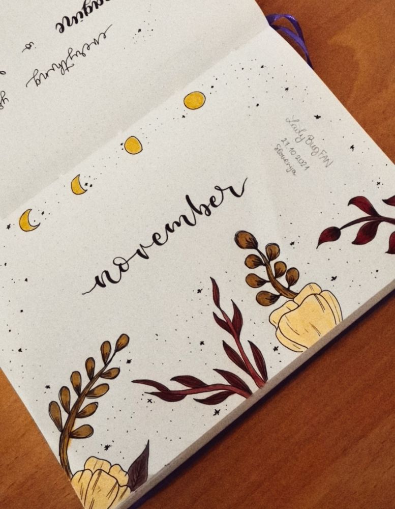 No glede teme.. Inspiracijo sem našla na pinterestu pa sem jo malce spremenila, ker je bila originalna tema z Dutch door (nekakršna vratca..oziroma, kot okno v bujotu), ampak si nisem upala z nožem rezati v mojem zvezku ahah..šla sem pa za nekakšnoo jesensko paleto barv, ker me rdeča, rjava, oranžna razveseljujejo, če je to logično ahaha. No upam, da vam je všeč.<3