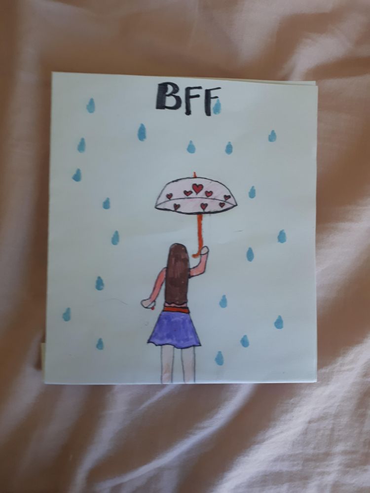 Narisala sem deklico ki ima v roki dežnik v drugi roki pa drži ogrlico prijatelstva za svojo BFF.:kissing_heart: