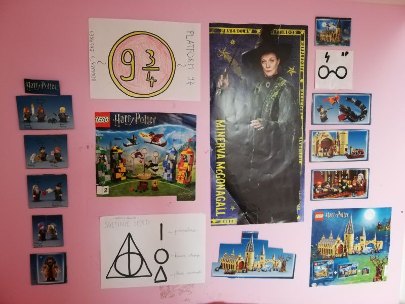 Jaz imam nad posteljo ful Harry Potter posterjev... Ene sem narisala sama, eni so iz enga koledarja k sm ga mela (McGonnagal) eni so od navodil za lego kocke eni deli so pa izrezani iz škatle.