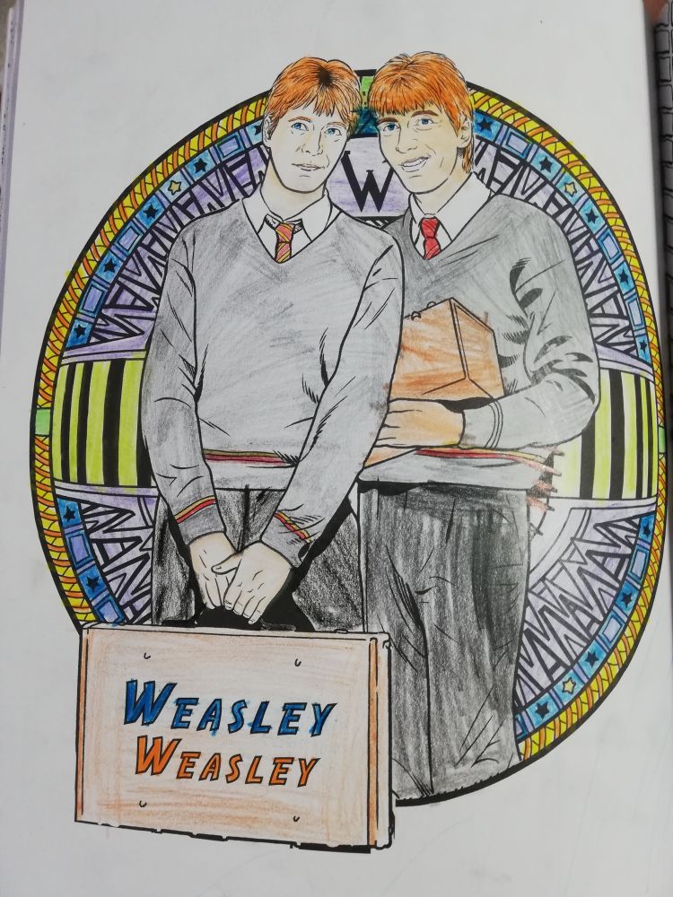 To sem barvala skupaj z Lichy, jaz sem barvala tistega, ki drži kovček 'Weasley Weasley' ter ozadje.