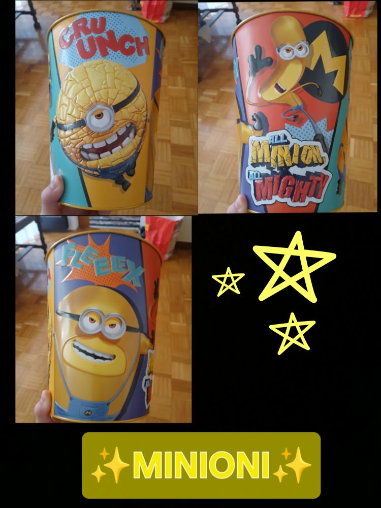 Včeraj smo bili v kinu in sem za kokice dobila pločevinasto škatlo z MINIONI (vidite jo spodaj :point_down_tone1:). Prikazujem jo iz več strani.