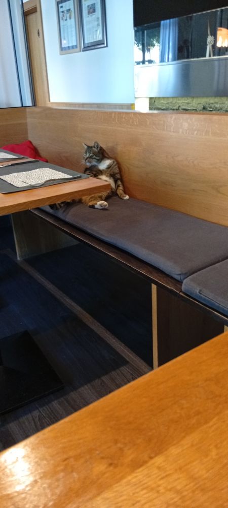 sli smo jes in je v gostilno pršla maćka skočla na sedežno in se zacela lizat. zgledal je k da caka na pizzo.