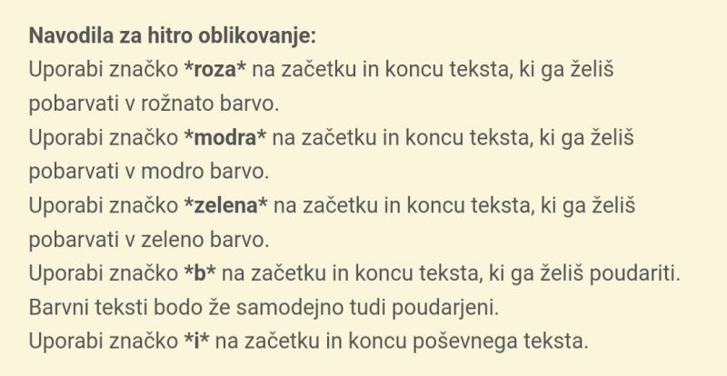 Pc ti ce hocs da je tekst roza barve ti napises * roze* pred in nakonc tega teksta k ga hoces obarvat (sm pc brez presledkou).