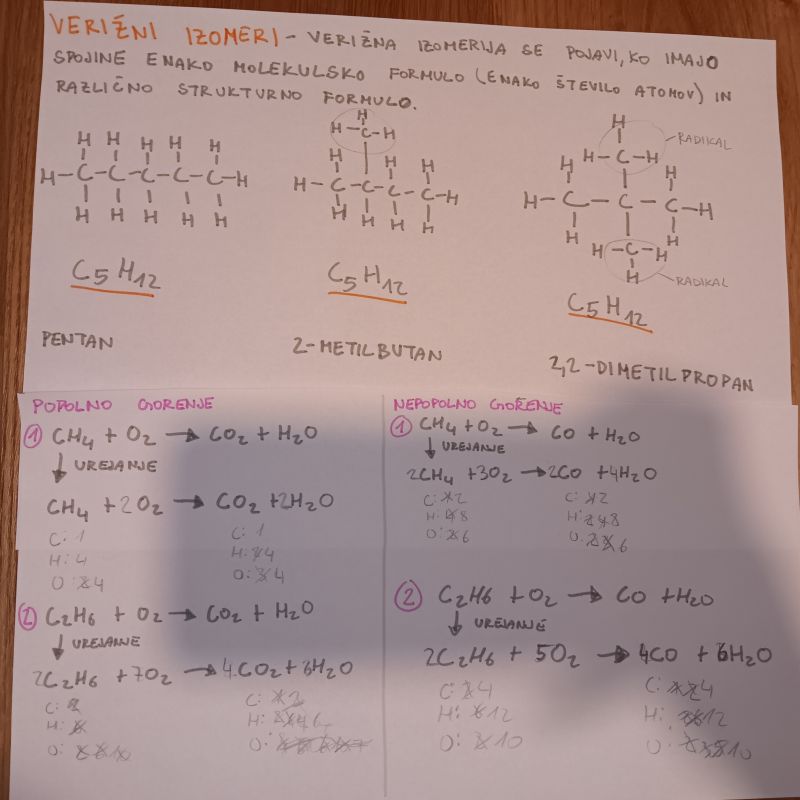 napisala sm popolno in nepopolno gorenje CH4 pa C2H6. napisala sm tud urejene enacbe, ampak predlagam da probas napri sama uredit enacbe.