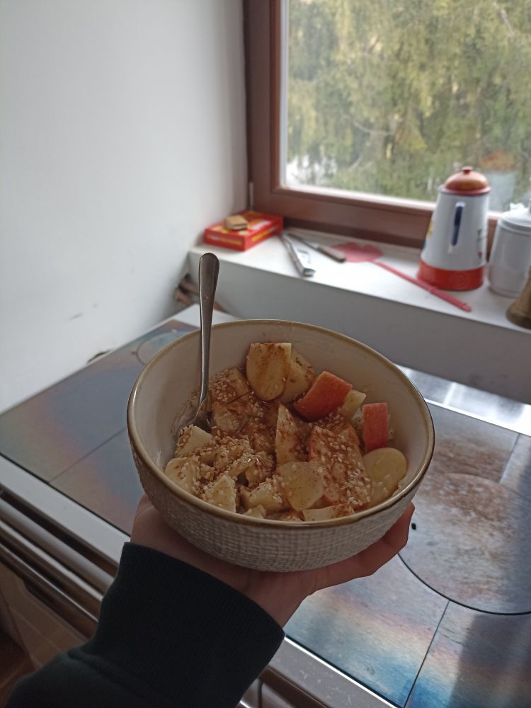TOREJ na dnu je seveda grški jogurt s cimetom, nato jabolko in banana s cimetom, še malo sezamovih semen (malo?) in med. njam. :D