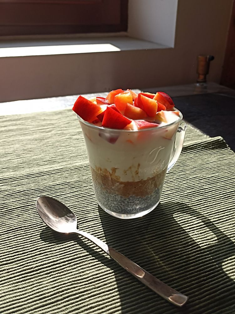 je nekakšen chia puding z jogurtom in ovsenimi kosmiči. najprej sem chia semena potopila v mleko in so tako narasla, pa sem dala le 1 žlico. pustila sem v hladilniku za nekje pol ure. druga plast so kuhani ovseni kosmiči z ogromno cimeta (saj me poznate). nato je jogurt skyr, nato čisto malo vanilikevega jogurta in nektarina.