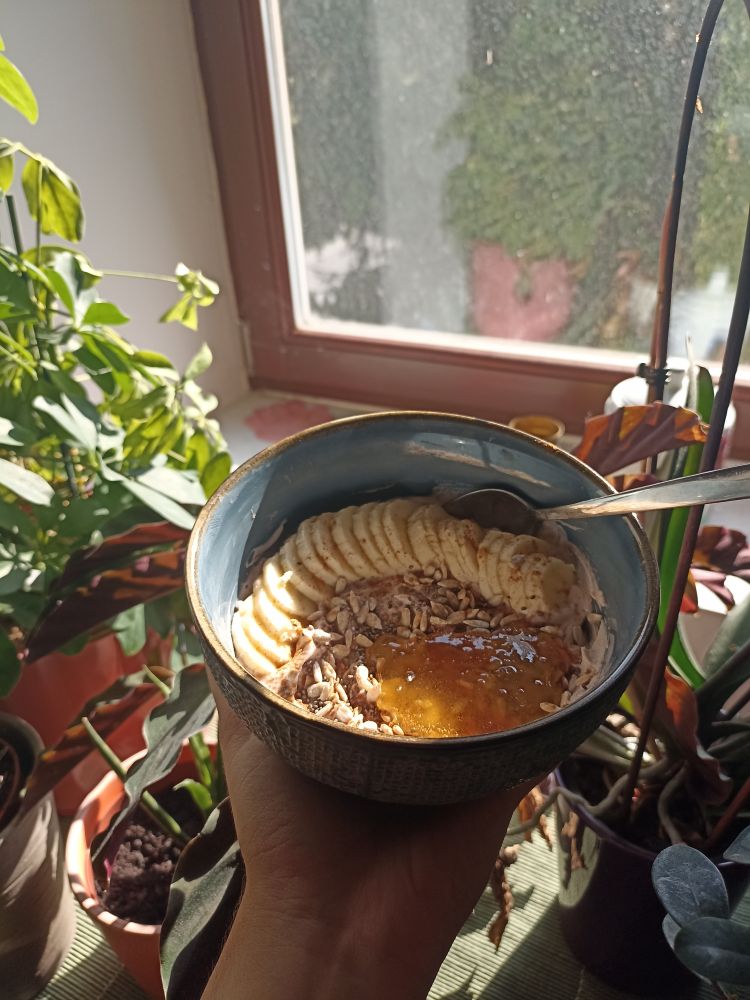 js sm isto jedla grški jogurt sam da s breskvami, kosmiči , sončničnimi semeni pa medom v real isti skledi kt je tvoja ahaha nvm vsaj tko zgleda haha