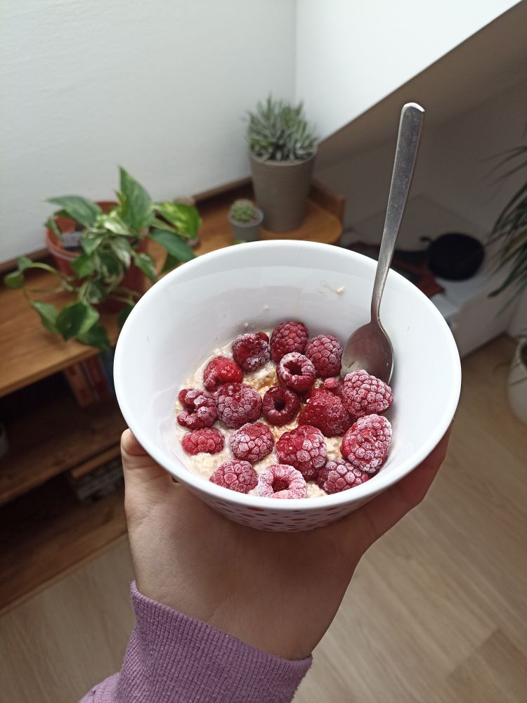 tale je nek oatmeal oziroma ovsena kaša. spodaj so ovseni kosmiči z okusnom maline in vanilije (kako to nardijo?? božansko je), ki so namočeni čez noč v vodo. zjutraj sem dodala zmrznjene maline na vrh, ker so pač okusne. njam.