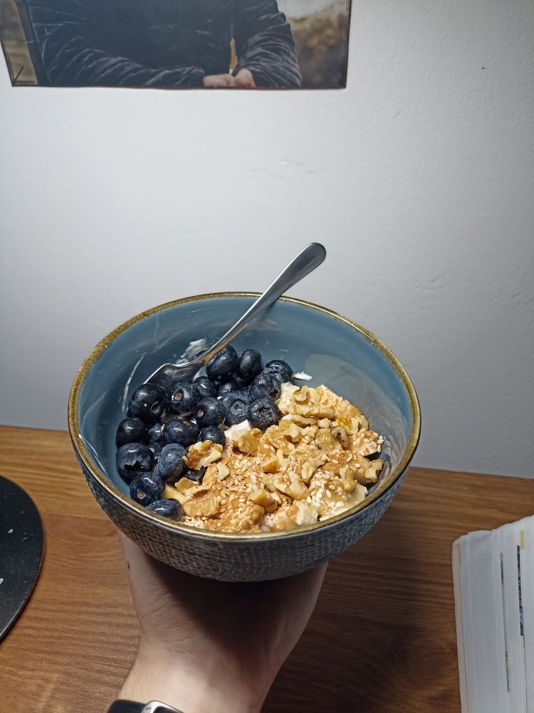 na dnu je seveda grški jogurt z ogroooomno cimeta, dodala sem banano in borovnice, preko potresla življensko dozo cimeta, sezamova semena in nekaj orehov, za konec pa sem dodala še letno zalogo cimeta :P