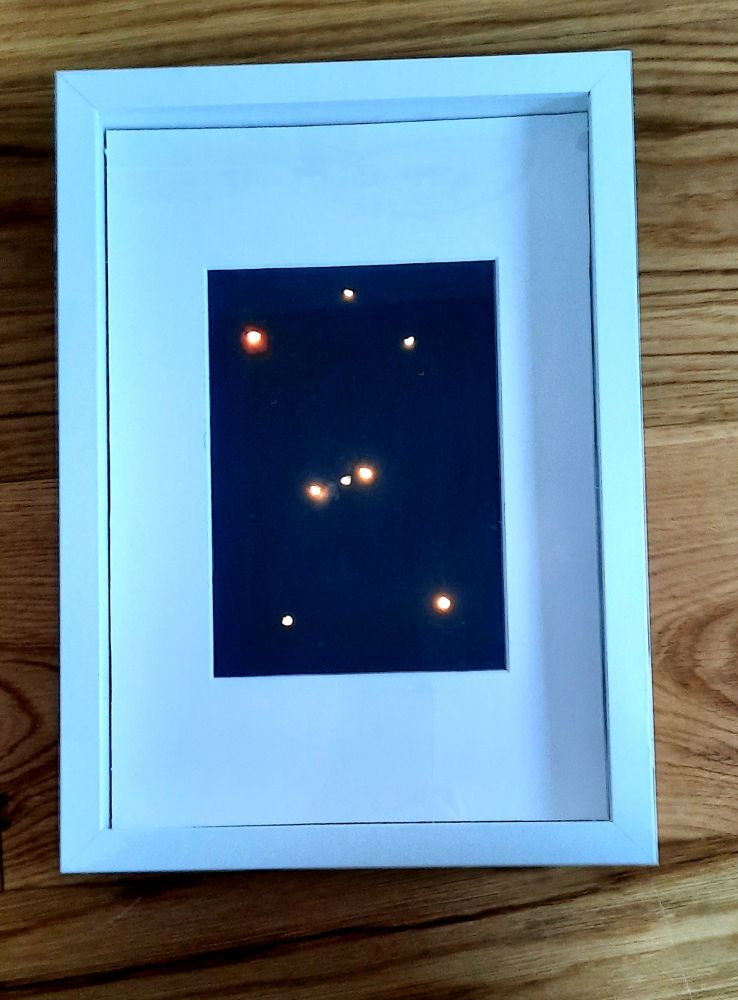 Najprej sem kupila debel okvir, potem vzela karton in ga prebarvala, potem sem naredila luknje in dala zraven lučke, potem pa vse zaprla.