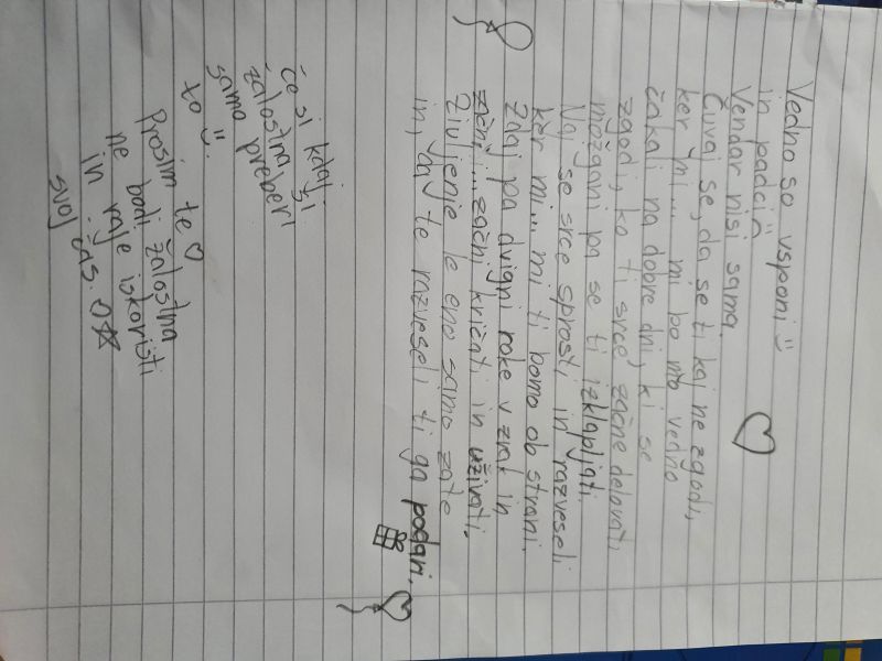 hey to pesem sem napisala prijateljici ker je žalostna. Upam da ne bo več če prqv ta pesem se mi zdi grozna in ne logična ampak okej. ČE SI KDAJ ŽALOSTEN SI TO PREBERI. Pa meni kdaj pomga tudi ta posbetek :rofl::rofl::rofl::rofl: https://youtu.be/ur48jVNNlKk upam da vam pomaga napišite v kom če bi vam pomgalo ali če vam je :blush:.