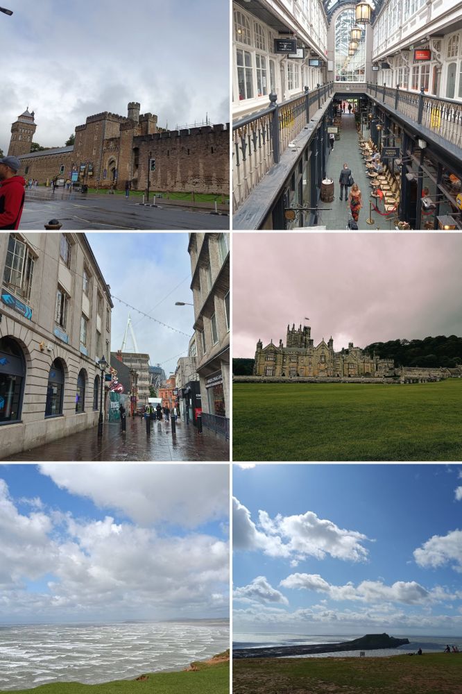 Najprej smo se po zajtrku v dežju (kako neverjetno :joy:) peljali do starega dela Cardiffa, kjer je bo polno zapor in tega zaradi rugbyja, ki je bil zvečer v areni prav tu. No, najprej smo v dežju šli v bližnji Starbucks in potem je dež malo zopet ponehal in smo šli do Cardiffškega gradu, ki je kar sredi mesta (ne na hribu ali kaj takega ...) - *b*slika zgoraj levo*b*. Šli amo tudi čez obzidje (ampak ne prav notri), kjer se sicer ni videlo prav veliko, ker so pripravljali za nek koncert. Potem je spet začelo deževati :rolling_eyes: in šli smo v stari del mesta, kjer je najprej en pokrit del z restavracijami in greš lah na balkon - *b*slika zgoraj desno*b*. No, nato smo šli v pravi stari del - *b*slika na sredini levo*b*.