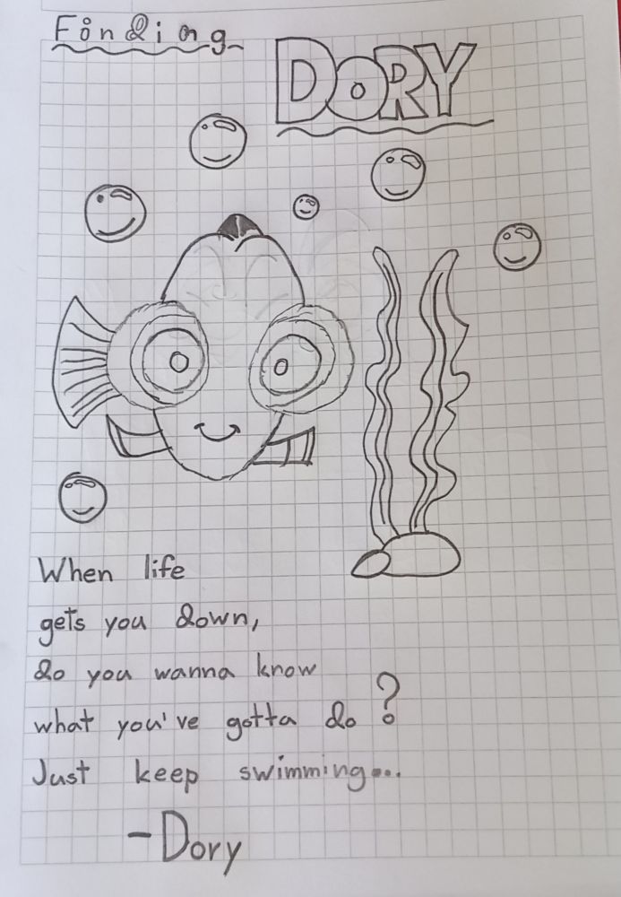 Ful lepa risba!! Sicer nisem gledala, ampak sem v eni knjigi prebrala, da je rekla : "Samo plavaj naprej.":purple_heart: