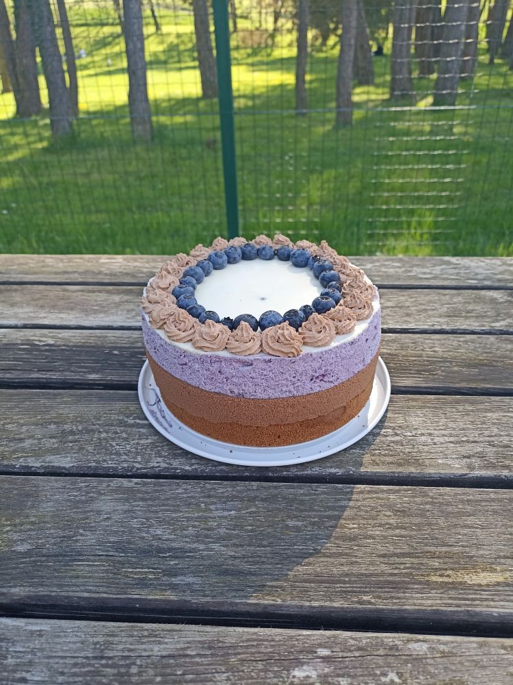 toraj spodaj je čokoladen biskvit, nato čokoladna krema, nato borovničeva krema s koščki borovnic, nato pa zelo zelo tanka plast kreme iz bele čokolade.