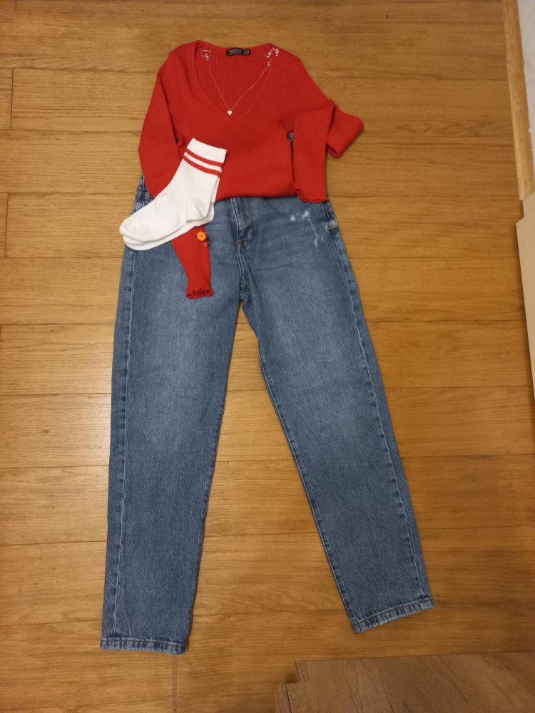 Danes mamo en tale rdeč 'pulovrček', pol pa temnejše mal oversized jeanske. Matchy bele nogavice s črtami. Od nakita pa danes silver ogrlica z roza srčkom in pa mal funky prstan različnih barv<3
