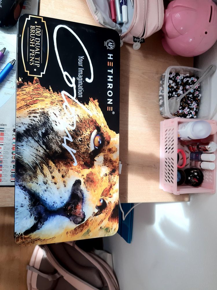 Uh....... Js mam Angoo peresnico?! Sploh nisem vedela da jo imam. 🤭 Pe resnica je iz Amazona pisala sem pa preppy pencil case. Stala je pa 10 evrov. Košarica je iz Trdijo. Stala je 1 evro. Perlice so tudi iz Tedija. Cene se ne spomnim.