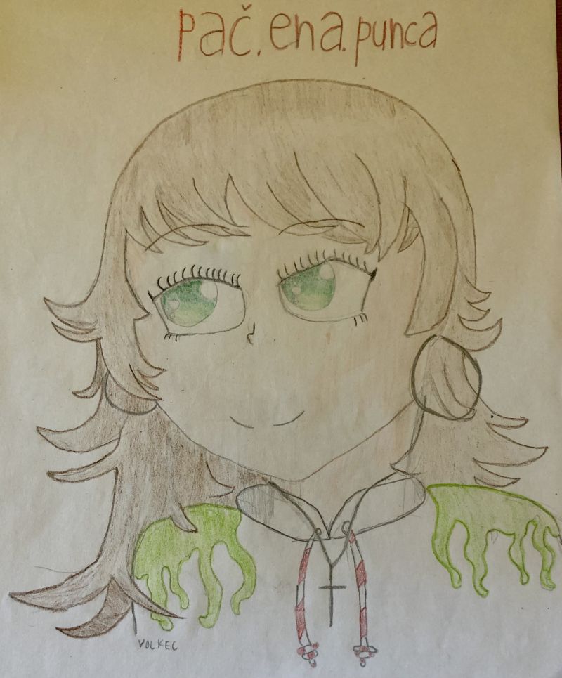 Tu je tvoja slikica, ki sem jo naredila po opisu. Upam, da sem frizuro narisala prav. Ozadja nisem dodajala, zato sem se malo bolj posvetila puloverju.
