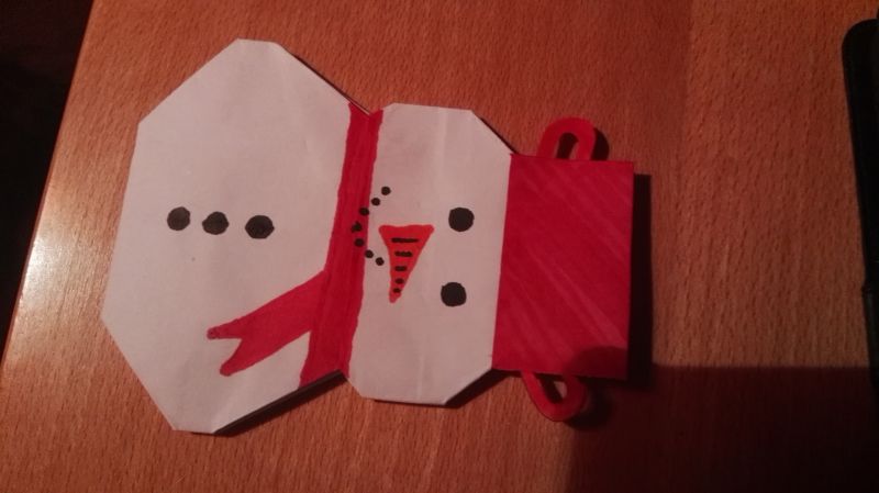 naredila sem origami snežaka, notri dala bonbon in to bom dala bratcu za god