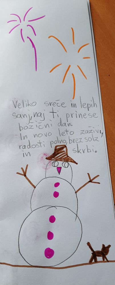 Odilčna misel, ki ima sporočilo in mi je zelo všeč. Poleg tega, pa si narisala snežaka in ognjemete, ki so božični in so mi všeč. Potem pa vidim še žival, ki risbo popestri in je nadvse lepo. Dam ti 44 točk, za izvirnost in kar celo risbo.