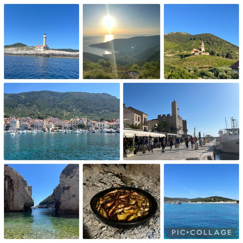 zjutraj po kar neprespani noči smo ustal in odplul do velikega budikovaca, to je manjše otočje zraven visa. okol pol 12 smo pršli in se zasidrali v zalivčku. tam smo tudi skuhali kosilo in pojedli. po kosilu smo se odpravili do plaže stiniva. stiniva je znana plaža na otoku vis, je pa mal drugačna od drugih. tam je blo ful meduz zato smo hotl it s supom do plaže sam pač se je pr štirih sup že potopiu logično hahaha, zato smo dal dol iz jadrnice gumenjaka in šli znim do plaže. tam smo mal poslikal in si ogledal zanimivo plažico. čez dve urce pa smo pršli do naše marine v komiži. manjše ful kjut mestece z ogromn mački haha. ko smo plačal marino in use smo šli peš mau po mestu, v trgovino in na večerjo na vrhu hriba hum(sveti duh), kjer je malo pod hribom še manjše naselje. tam smo povečerjali pri znancu maminega bratranca(on je naš skiper). starejši so si privoščili, hobotnico midva z bratcem pa ribo. po večerji smo šli na jadrnico in spat ker je biu pred nami dug dan<3