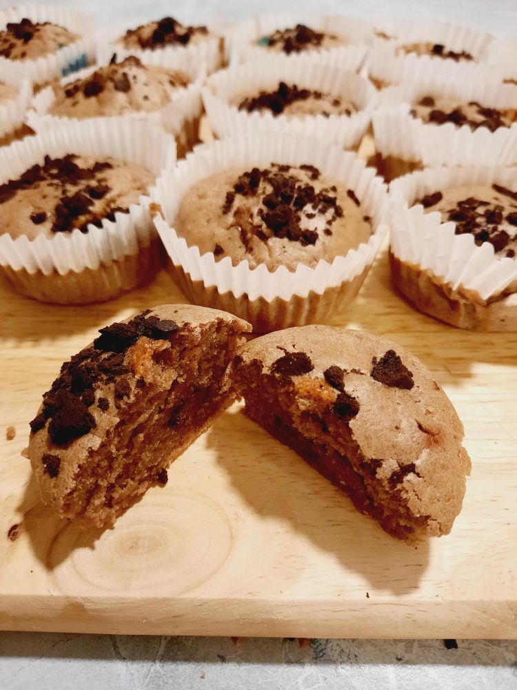 najprej penasto umešaš jajci in sladkor, nato dodaš moko, mleko in pecilni prašek, vse skupaj premešaš. Na koncu dodaš še barvilo oz. kakav. Za okras sem jaz dodala m&m bonbone različnih barv ter zdrobljene oreo piškote(v trgovini dobiš že zdrobljene).pečeš jih na 180°C, na ventilatorsko pečenje. Pečeš cca. 15 min
