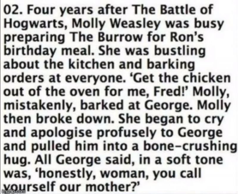 Štiri leta po vojni za Bradavičarko je Molly Weasley zaposlena z pripravljanjem Jazbine za Ronovo rojstnodnevno kosilo (ig). Delele/razbijala je po kuhinji in vsem ostalim govorila kaj rabijo narediti. ''Vzami piščanca ven iz pečice Fred!'' Molly po nesreči reče Georgeu. Potem se je zlomila. Začela je jokati in se opravičevati Georgu in ga objela. Goerge je potem z mehkim tonom v glasu rekel: ''Resno in ti praviš, da si najina mama''