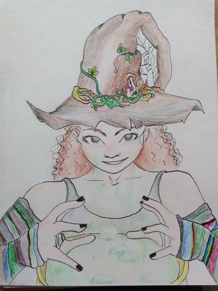 Zdravo! Najprej bi samo rekla da sem čisti začetnik in da se še učim😅, če pa že želiš slišati moj postopek od ideje do izdelka pa je takle: ko imam v glavi oblikovano idejo na navaden A4 naredim hitro skico ki mi je v oporo ko začnem risat. Ko sem s tem načrtom kolko tolko zadovoljna začnem risati skico na drugem papirju, tukaj pride na vrsto moja največja ljubezen na svetu ✨PINTEREST✨. Pobrskam za referenčne slike, ki mi pomagajo pri risanju. Pri tej risbi sem naprimer uporabila fotografijo čarovniškega klobuka in kotla, za pozicijo rok pa sem slikala sama sebe v položaju kot bi bila čarovnica na sliki😁. Ko sem 100% zadovoljena s skico jo obrišem z nalivnim peresom ali kakšnim drugim tankim črnim pisalom. Izberem barve ki jih bom uporabljala (če uporabljaš samo svinčnike različne trdote svinčnikov). In pač se lotim barvanja. To je to🙃.