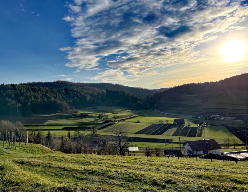 Na fotografiji je južni del Velikih Brusnic. Za to fotografijo sem se odločila, ker zajema vse glavne značilnosti brusniške krajine. V njej se ravninski del, na katerem prevladujejo njive in travniki, poselitev pa je strnjena obcestna in gručasta, prepleta z reliefno razgibanimi gričevnatimi predeli, kjer se izmenjujejo gozdovi, travniki, sadovnjaki, vinogradi, poselitev pa je razpršena.