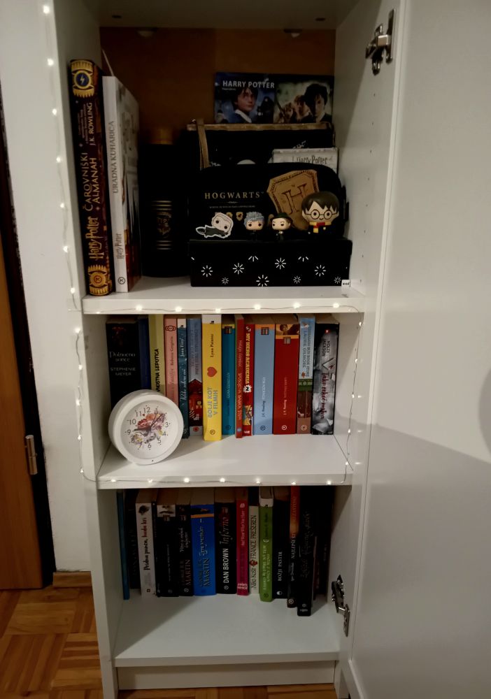 po zelji fangirl je tule slikica moje knjizne omarce, mby je mal aesthetic zarad luck hah drgac pa jaa tle mam spravlene vse svoje knjige pa harry potter zadevce:)