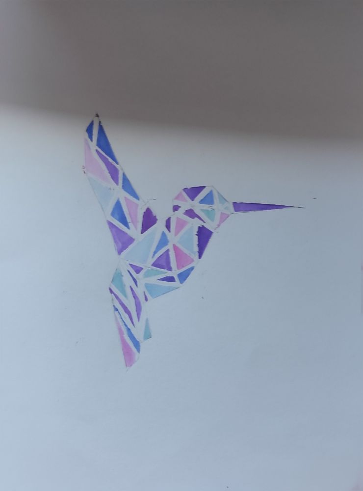 jaz sem imela kar preveč časa in sem narisala colibrija iz trikotnikov, verjetno ste že kje videli tako sliko, ker jih je kar veliko. V glavnem z lepilnim trakom sem pokrila bela območja in nato v barve vijoličnega sončnega zahoda obarvala trikotnike.