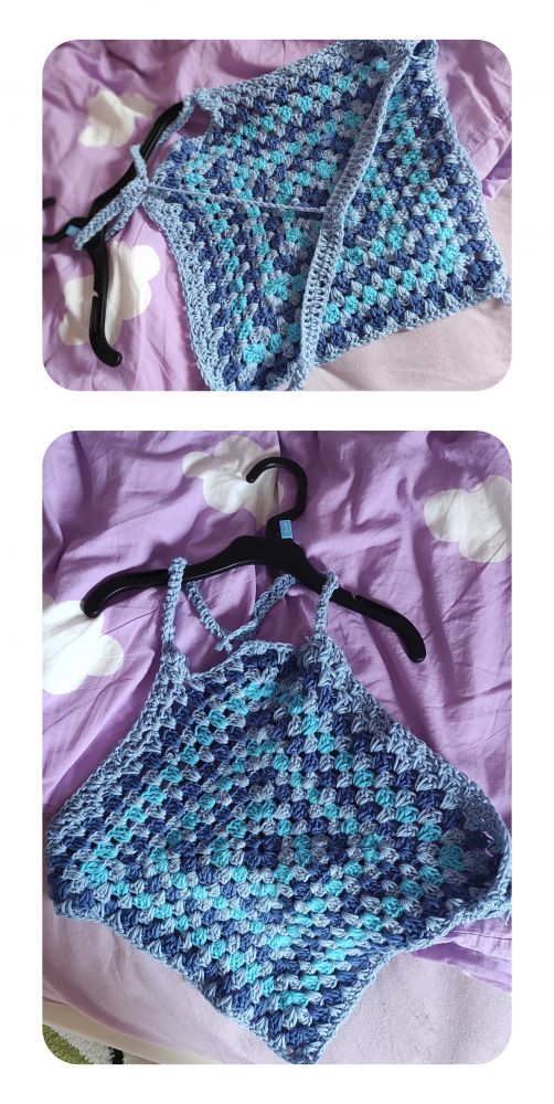 Končno sem končala svojo majčko. Torej to je v bistvu huge granny sqare, mi je oa ful žal, da vam ne morm pokazat kako zgleda na meni, saj bi objava bila verjetno izbrisana. Naramnice so malo tanke ker mi je zmanjkalo volne...ups🥴 Slikan pa je od spredaj in od zadaj. Je pa ful faj za nositi ker je bombažna volna :thumbsup: