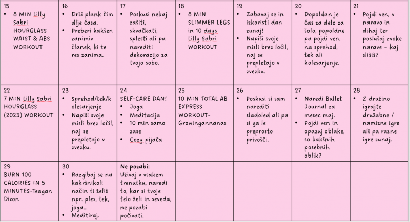 Navedeni workouti so samo moja osebna priporočila, ponekod sem dala več možnosti, če morda nimate idej ali časa za izskanje drugega...vse te lahko najdete na youtubu AMPAK, če imate raje druge workoute in imate svojo workout rutino pa vas iskreno prosim, da delajte workoute, ki si vam všeč<3