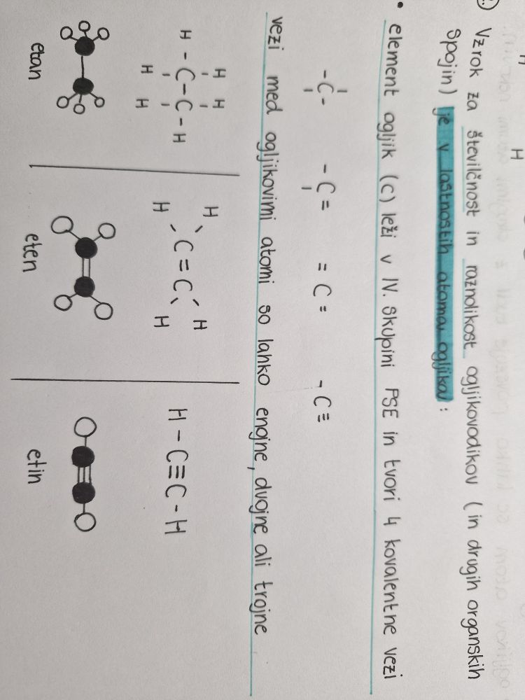 Potem se pa verjetno spomniš iz 8. ko smo risali take pikice, ki so ponazarjale valenčne elektrone https://eucbeniki.sio.si/kemija8/940/index4.html tu imaš na primeru molekule dušika. In tako se zgodi tudi v ogljikovodikih. Torej, le se z eno vezjo veže z ogljikom, se z tremi mora vezati z vodikom. Ti so nasičeni, ker imajo samo enojne vezi. Nenasičeni, pa imajo trojne in dvojne vezi. Če ogljik tvori dvojno vez tvori dve vezi z drugim ogljikom, ne more je pa z vodikom, saj lahko ta tvori le eno vez.