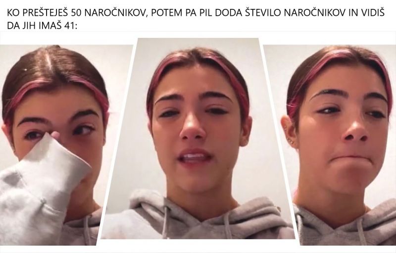 Aja in za charli damelio fan: najprej sem vtipkala v google 'charli d'amelio meme faces', potem pa izbrala enega dobrega (saj ga vidiš na sliki). Dala sem desni klik in 'shrani kot...'. Shranila sem, potem pa uredila (dodala besedilo) v urejevalniku fotografij. To je vsa umetnost ;)