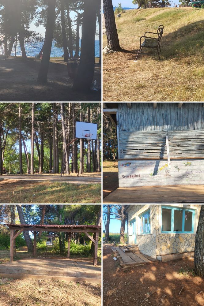 Hiij, tokrat sem pripravila kar kolaž in sicer na prvi sliki je plaža in košarkaško igrišče, na drugi klopca posvečena mileni sthiner(nevem kak se napiše prav??), na tretji je boljše vidni koš na katerega je metal mark (matej zemljič), na četrti je tam dino( nevem kak mu je real ime) mel potapljaško opremo, na peti je parcela od marka in edvarda ter zadaj se čist mal vidijo wc-ji(nisemi dalo tam hodit ker so brezdomci not, pol na šesti pa je recepcija.