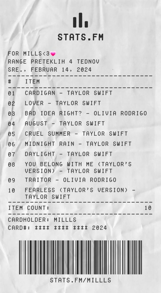 odlocla sm se da na usake tok casa objavm moj spotify list k je ena aplikacija stats.fm in ti pac kere so tvoje top pesmi ceprou ni lih res kr pr men je cruel summer na 5 mestu pa sm jo dvakrat poslusala:upside_down:
