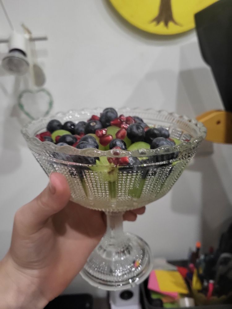 Tole je pa taka sadna bowla spodi so banane, pol grozdje, borovnice in granatno jabolkoooo. Men je to iskreno takkk dober sam še jagode pa maline mankajooo.