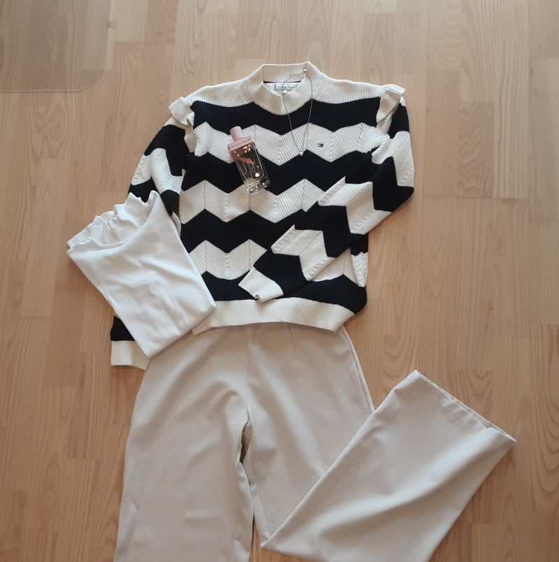 je pa pulover tommy hilfiger, majica z dolgimi rokavi iz ovs-ja, za hlače ne vem, pol pa še verižica in parfum women's secret za piko na i.