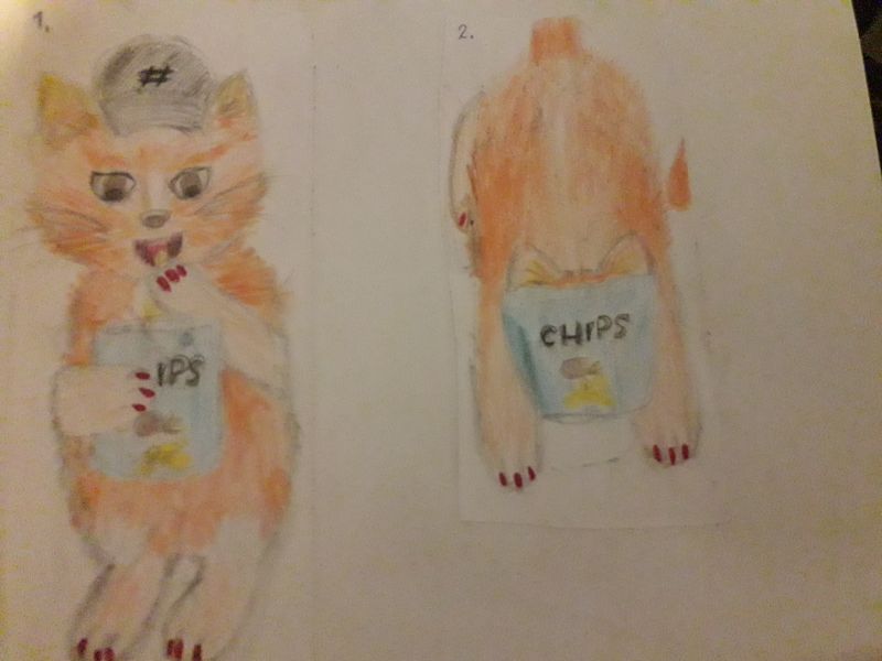 Narisala sem muco ki je cips na dva nacina prva ga je elegantno druga pa po macje:grin: