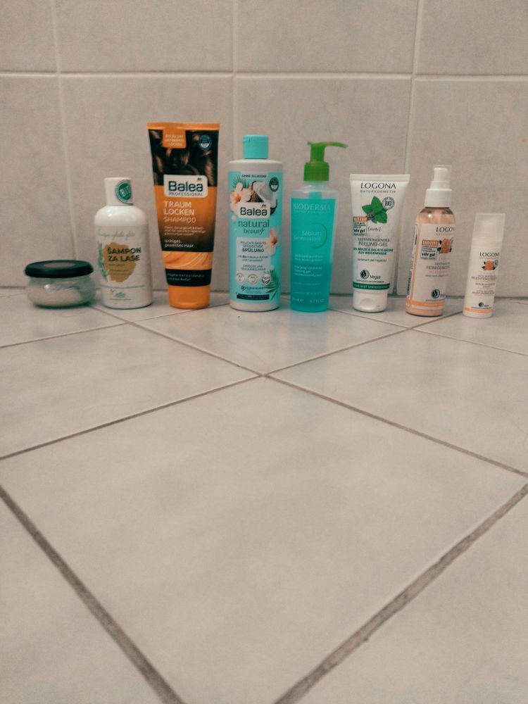 Skrajno levo je piling za telo nato dva šanpona balzam, čistilo za obraz, piling za obraz in na koncu še dve kremi za obraz.