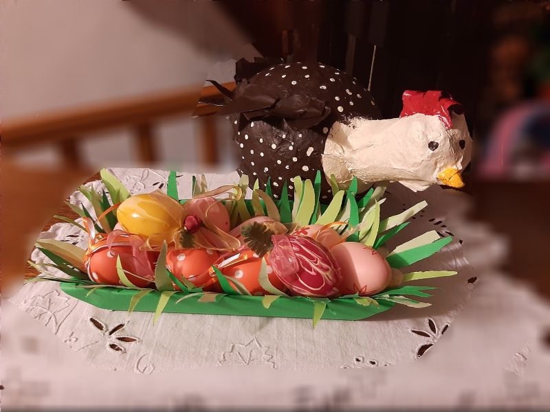 Danes sem delala velikonočno dekoracijo in iz ustvarjanja je nastala kokoš. Oleg je tudi košarica za pirhe, ki naj bi ponazarjala travo.