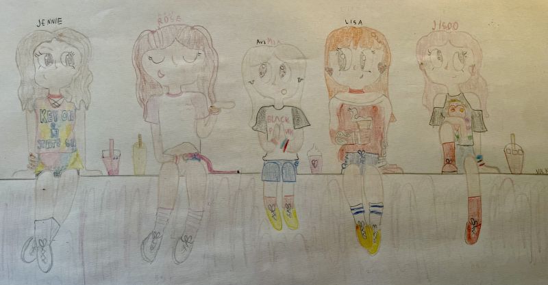 Tukaj je tvoja risbica BlackPink:black_heart:🩷 obleke sem narisala te, ki so jih imele oblečene v videospotu tvoje najljubše pesmi:notes: ( res jih veliko zamenjajo:sweat_smile:) Toliko veliko ljudi je res izziv za risat zato mi je vzelo kar nekaj časa in ni tako dobro kot konjček:pensive: ...